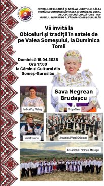 Sălăjenii sunt invitați duminică, 19 aprilie, la o adevărată sărbătoare găzduită de Căminul Cultural din satul Someș-Guruslău. Începând cu ora 17 va începe evenimentul intitulat „Obiceiuri și tradiții în satele de pe Valea Someșului, la Duminica Tomii”. Spectacolul este organizat de Centrul de Cultură și Artă Sălaj, Primăria Năpradea, Asociația Culturală „Cristina” și Muzeul din Someș-Guruslău. Pe scenă vor urca Sava Negrean Brudașcu, Rodica Pop Seling, Ansamblul Vocal „Cristiana”, Robert Ciurte, și Ansamblul Folcloric „Meseșul”.