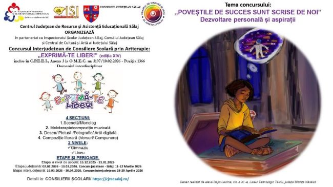 Concursul interjudețean de consiliere școlară prin artterapie „Exprimă-te liber!” ajunge la o nouă ediție. Evenimentul va avea loc în perioada 11-12 martie 2026 și este organizat de CJRAE Sălaj, în parteneriat cu Inspectoratul Școlar Județean Sălaj, Consiliul Județean Sălaj și Centrul de Cultură și Artă al Județului Sălaj. „Credem în puterea artei de a transforma emoțiile în culoare, gândurile în creație și visurile în curaj. Oferim elevilor un spațiu sigur în care să-și descopere vocea interioară, să-și exprime trăirile și să-și valorifice creativitatea. Prin artterapie, învățăm că fiecare emoție contează,…