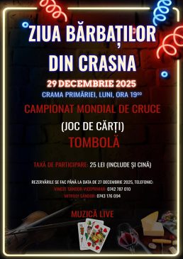 Iubitorii jocului de cărți „Cruce” sunt invitați luni, 29 decembrie, începând cu ora 19, la Crasna, localitatea găzduind, susțin organizatorii, un campionat mondial de „Cruce”, joc de cărți cunoscut și îndrăgit de atâția oameni. Tot cu această ocazie va fi marcată și „Ziua bărbaților din Crasna”. Evenimentul se va desfășura în crama din sediul primăriei, iar înscrierile se pot face la numerele de telefon: 0742 787 010 și 0743 176 094. Așadar, între sărbători „mere o cruce”. Succes!