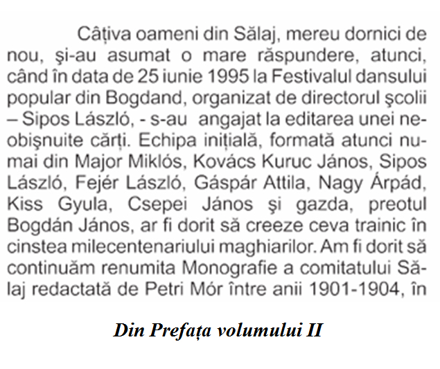 De atunci a apărut și volumul al 3-lea din monografia Maghiarii din Sălaj, volum la care însuși decanul istoricilor ardeleni, academicianul Dr. Egyed Ákos, a scris prefața intitulată – Recomandare. Domnia-sa este un bun cunoscător al Sălajului.