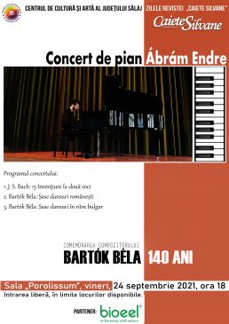 Centrul de Cultură și Artă al Județului Sălaj organizează vineri, 24 septembrie, începând cu ora 18, în Sala “Porolissum”, în cadrul celei de a XIII-a ediţii a Zilelor revistei “Caiete Silvane” un concert de pian Ábrám Endre. Intrarea este liberă, în limita locurilor disponibile. Ábrám Endre s-a născut la Târgu Mureș. A studiat la Universitatea de Muzică Liszt Ferenc din Budapesta, unde a putut învăța de la Jandó Jenö, Falvai Sándor, Kiss Gyula, Reti Balázs și Gulyás Márta. În luna octombrie a anului 2015, a susținut la Zalău un recital de pian, împreună cu pianistul clujean Veress Gáspár. Recitalul de la Zalău are ca scop comemorarea compozitorului Bartók Béla, născut în urmă cu 140 de ani. Programul concertului: J.S.Bach – 15 Invențiuni la două voci; Bartók Béla – Șase dansuri românești şi Bartók Béla – Șase dansuri în ritm bulgar.