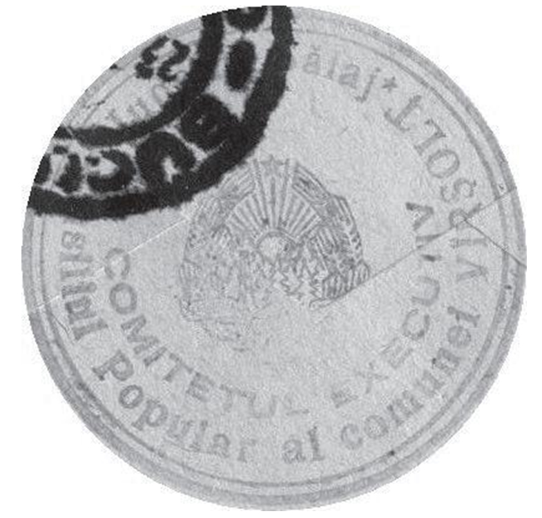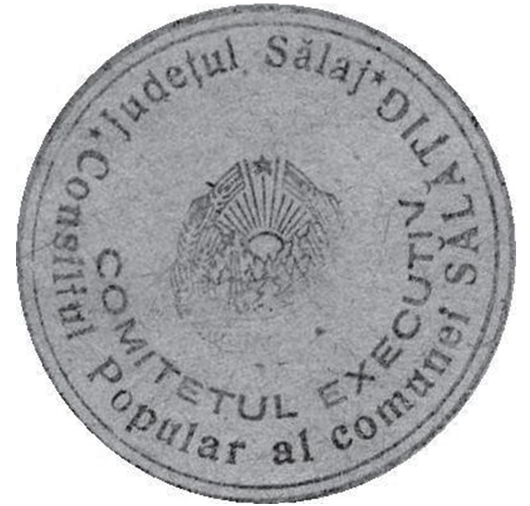 La Arhivele Naționale Istorice Centrale, pe trei documente emise în anii 1966, 1969 şi 1970 de Miliția raionului Zalău şi de Comitetele Executive ale Consiliilor Populare ale comunelor Sălățig şi Vârşolț (jud. Sălaj) către Casa de pensii şi ajutoare a salariaților Bisericii Ortodoxe Române, se află, imprimate cu cerneluri albastră şi purpurie, trei sigilii rotunde cu diametrele de 29 mm (primul) şi 33 mm (ultimele două). Ele cuprind în propriile embleme stema descrisă la art. 116 din Constituția Republicii Socialiste România din 1965: „Stema Republicii Socialiste România reprezintă munți împăduriți, deasupra cărora se ridică soarele. În partea stângă a stemei se află o sondă. Stema este încadrată de o cunună de spice de grâu. În partea de sus a stemei se află o stea în cinci colțuri. În partea de jos a stemei, spicele sunt înfăşurate într-o panglică tricoloră pe care este scris REPUBLICA SOCIALISTĂ ROMÂNIA”. La art. 6 din Decretul nr. 972/1968 privind însemnele Republicii Socialiste România s-a prevăzut: „Stema Republicii Socialiste România va fi reprodusă pe sigiliile organizațiilor socialiste de stat stabilite prin legi, decrete sau hotărâri ale Consiliului de Miniştri, pe imprimatele şi plăcile indicatoare ale edificiilor acestora, pe bancnote şi pe alte semne monetare emise în Republica Socialistă România, precum şi pe emblemele şi pe unele accesorii ale uniformelor militare, stabilite potrivit dispozițiilor legale”.