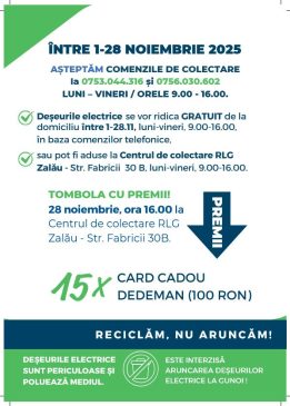 Vești bune pentru zălăuanii care vor să scape de televizoare și monitoare vechi. În perioada 1-28 noiembrie, la nivelul municipiului Zalău, RLG by Reconomy, în parteneriat cu municipalitatea, desfășoară o campanie gratuită de colectare a deșeurilor electrice. Scopul campaniei este gestionarea eco-rațională a acestor deșeuri, respectiv colectarea separată, tratarea, reciclarea, valorificarea și eliminarea lor, în conformitate cu prevederile legislației în vigoare. Punctul de colectare este situat pe strada Fabricii nr. 30B, iar deșeurile voluminoase vor fi ridicate de la domiciliu. Detalii suplimentare pot fi obținute la numerele de telefon: 0756 030 602 sau la 0753 044 316.