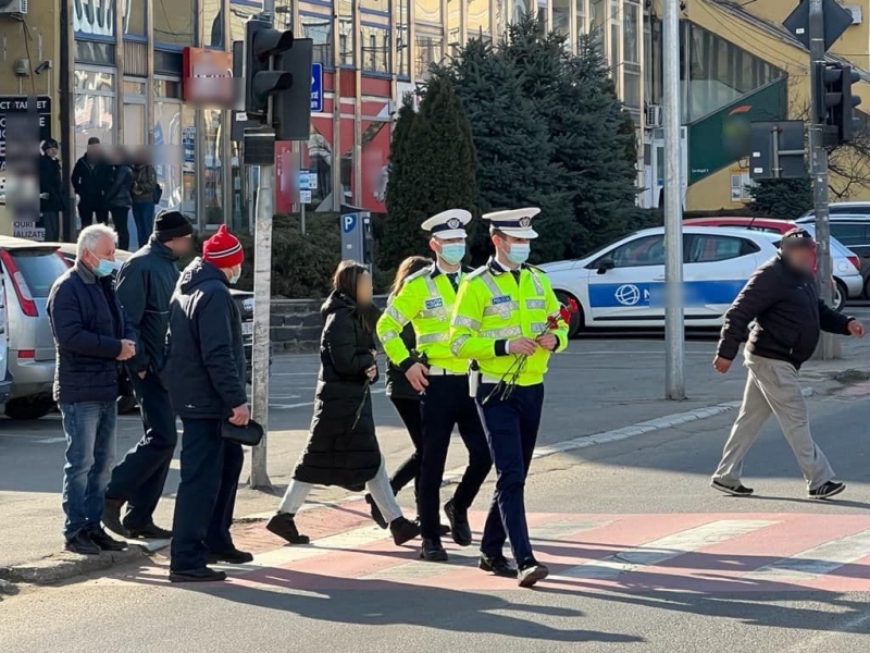 Astfel, pe lângă sfaturi preventive și recomandări, doamnele şi domnișoarele participante la traficul rutier au primit garoafe.