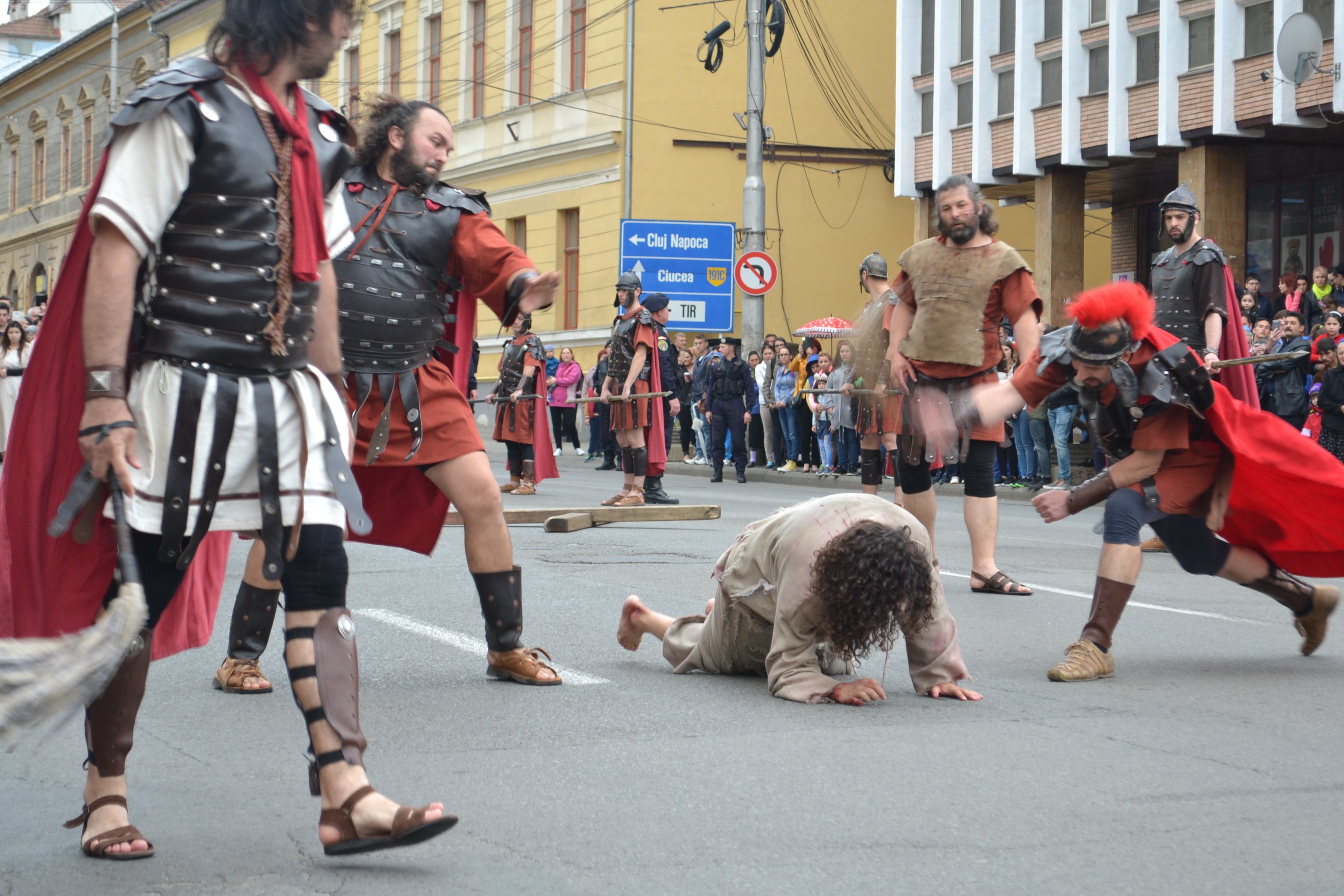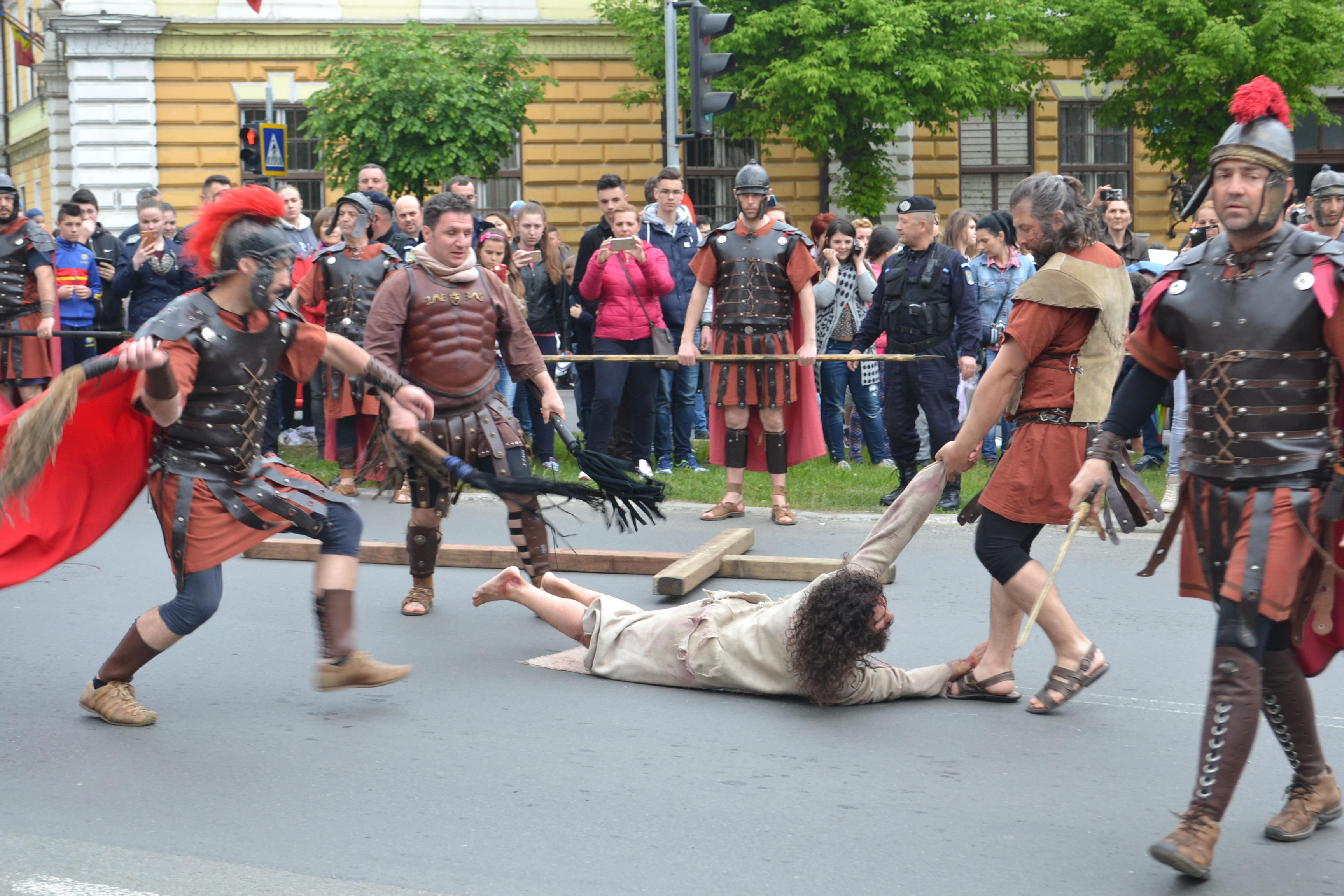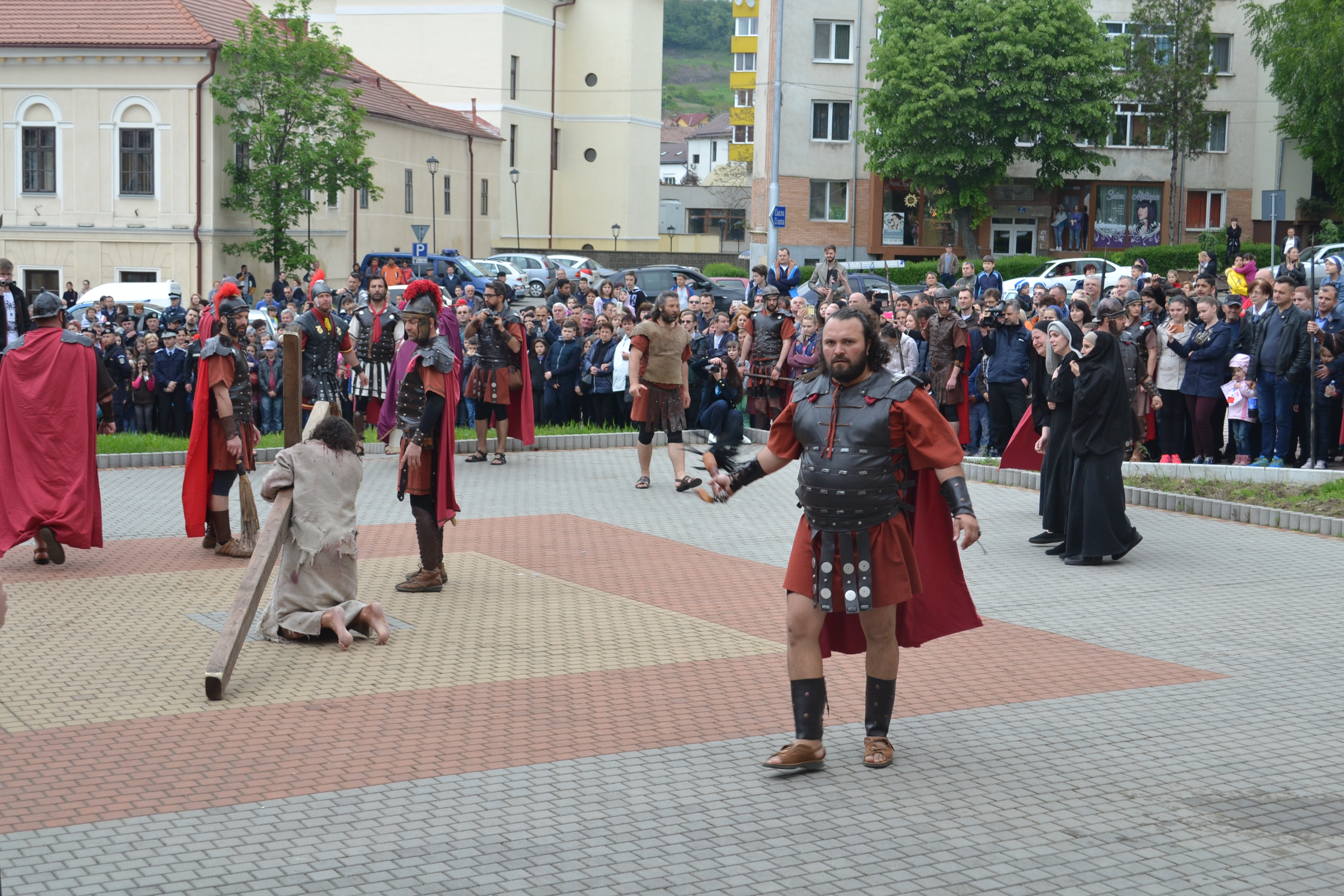 Un spectacol de stradă cutremurător s-a derulat sub ochii a peste 1.000 de zălăuani, în Vinerea Mare. Reprezentarea dramatică a “Drumului Crucii – cu moartea pe moarte călcând” a surprins suferinţele îndurate de Iisus Hristos înainte de a fi răstignit