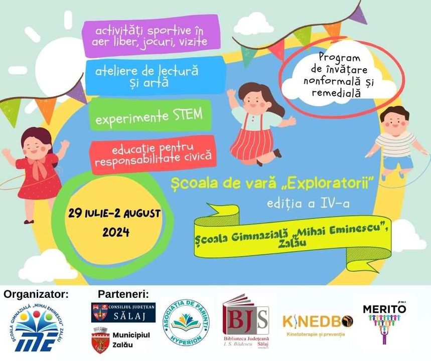 Pentru al patrulea an consecutiv, Școala Gimnazială „Mihai Eminescu” din Zalău derulează programul de educație nonformală și remedială Școala de vară „Exploratorii”, finanțat în acest an de Consiliul Județean Sălaj. Activitățile au debutat luni, în 29 iulie, și vor continua și în luna august.