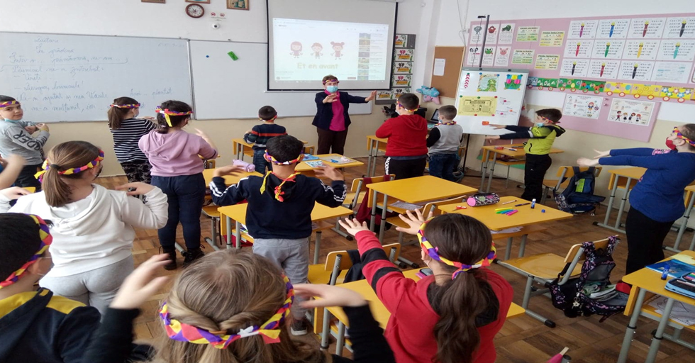 Pentru a-i sensibiliza pe cei mai mici, am realizat o activitate interactivă cu elevii clasei a III-a A, care în cadrul orei de Arte si abilități practice au învățat să își confecționeze banderole prin împletire .Elevii au fost încântați să afle culorile Francofoniei și să mimeze un cântecel ritmat “Mains en l’air”.