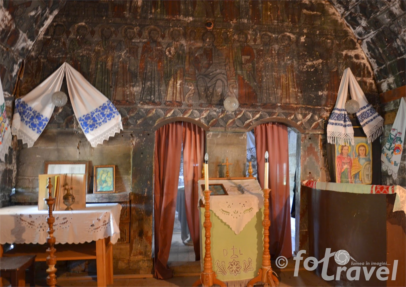 Ca să intri în biserică trebuie ”să te smerești” aplecându-te ca să poți trece de poartă. Asta dacă reușești să dai la o parte drugul de lemn, ce se deschide cu o cheie… specială ce constă într-o bucată rotundă de lemn, prevăzută în capăt cu o ”limbă” flexibilă. Odată introdusă cheia prin gaura din stâlpul din dreapta a ușii, limba cade între zimții drugului, astfel că prin rotire acesta culisează deschizând ușa. Ce mai, tehnică populară autentică! În pronaos, pictura realizată pe pânză, încă se mai menține deși este deteriorată în mare parte. Totuși se pot desluși chipuri de sfinți, iar dacă ai făcut limba rusă în școală și înțelegi caracterele chirilice, ai șansa să descifrezi ceea ce scrie. Asta pentru că scrie în limba… română! Trecere înspre naos se face prin intermediul unei uși semicirculare ce are ancadramentele sculptate. În colțuri se văd clar două roze, identice cu cele de afară.