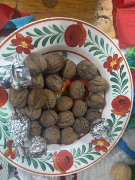 „La noi așa e obiceiul. Coacem plăcinte în fiecare sâmbătă. Le facem cu silvoiță, cu cartofi, punem și brânză, verdețuri când e sezon. Acum suntem în post, le preparăm doar cu cartofi și dulceață. Despre lompa cu fotoghin vă pot spune că era nelipsită din case pe vremea când nu era curent în sat. Femeile se pregăteau înaintea sărbătorilor, o curățau și o împănau cu hârtie creponată multicoloră. Apoi, lampa era așezată în cuiul bătut în grindă, deasupra mesei. Uitați-vă ce frumos arată”, a povestit bădăcinanca.