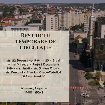 În acest interval orar, un singur sens de mers de pe următorul traseu va fi restricționat temporar pentru deplasarea participanților: str. 22 Decembrie 1989 nr. 25 – b-dul Mihai Viteazu – piața 1 Decembrie 1918 – str. Unirii – str. Simion Oros – str. Parcului – Biserica Greco-Catolică „Sfânta Familie”.